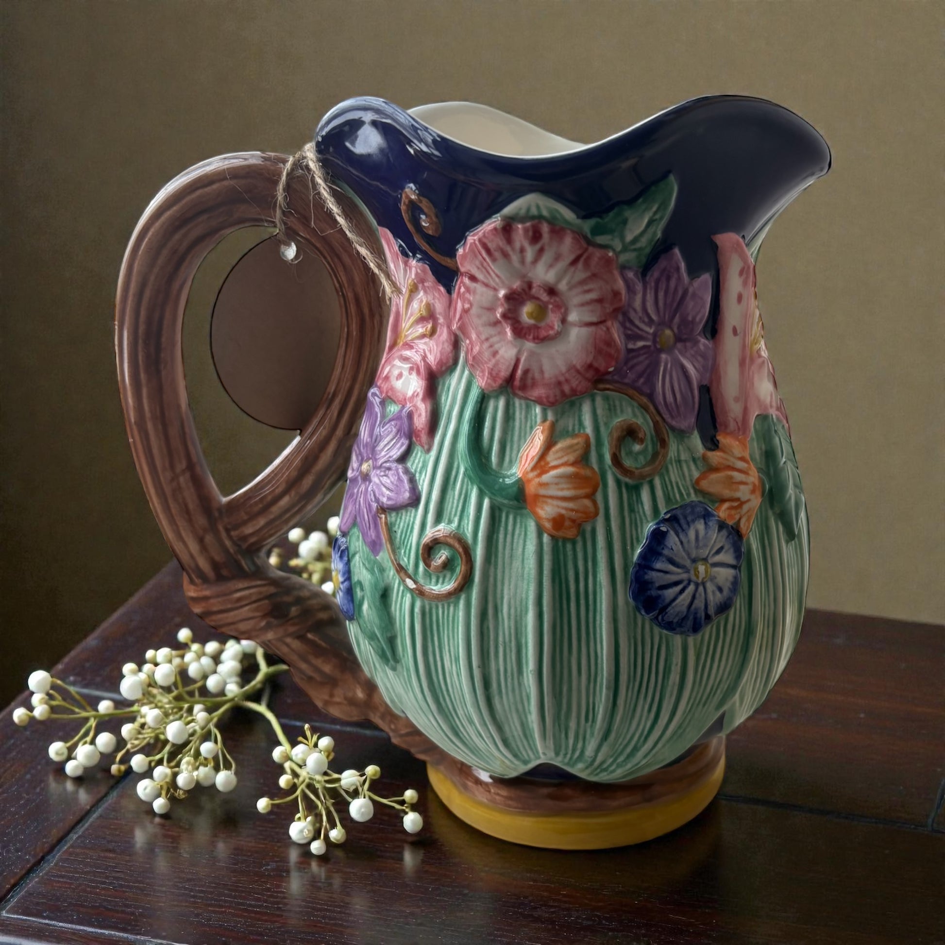 Rich colors, sculpted flowers, and a beautifully formed handle give this pitcher a whimsical, cottage-garden feel. Whether styled as a vase for fresh blooms or displayed as a standalone collectible, it brings personality and joy to any space.